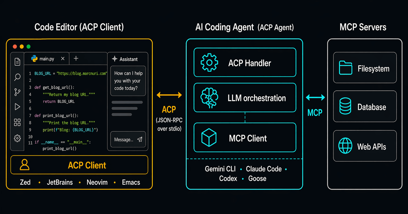 - ACP client — the code editor. Owns the UI and initiates the connection. Zed, JetBrains, Neovim, and Emacs are all clients today.