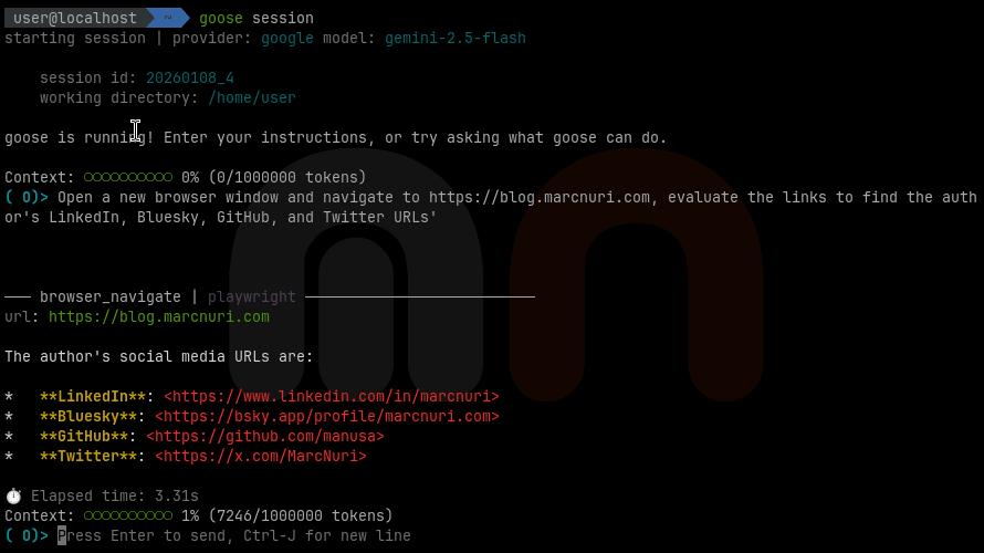 In the previous image, you can see the Goose session with the Playwright MCP server running in the terminal.